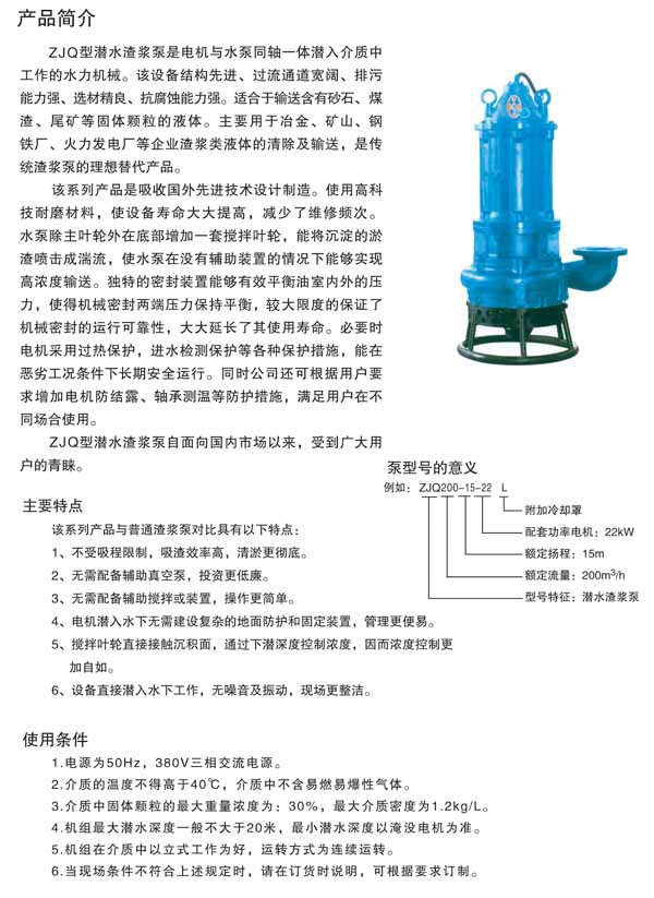 ZJQ型渣漿泵(bèng)是電機與水泵同(tóng)軸一體潛入介質中(zhōng)工(gōng)作的水利(lì)機械。該設備結構先進、過流(liú)通道寬(kuān)闊、排汙能(néng)力強;選材精良、抗(kàng)腐蝕能力強(qiáng)。適合於輸送含有砂石(shí)、煤渣、尾礦(kuàng)等(děng)固體顆粒的液體。主要用於冶金、礦(kuàng)山、火力發電廠等企業渣漿類液(yè)體的清除及輸送,是傳統渣漿(jiāng)泵的理想替代產品。